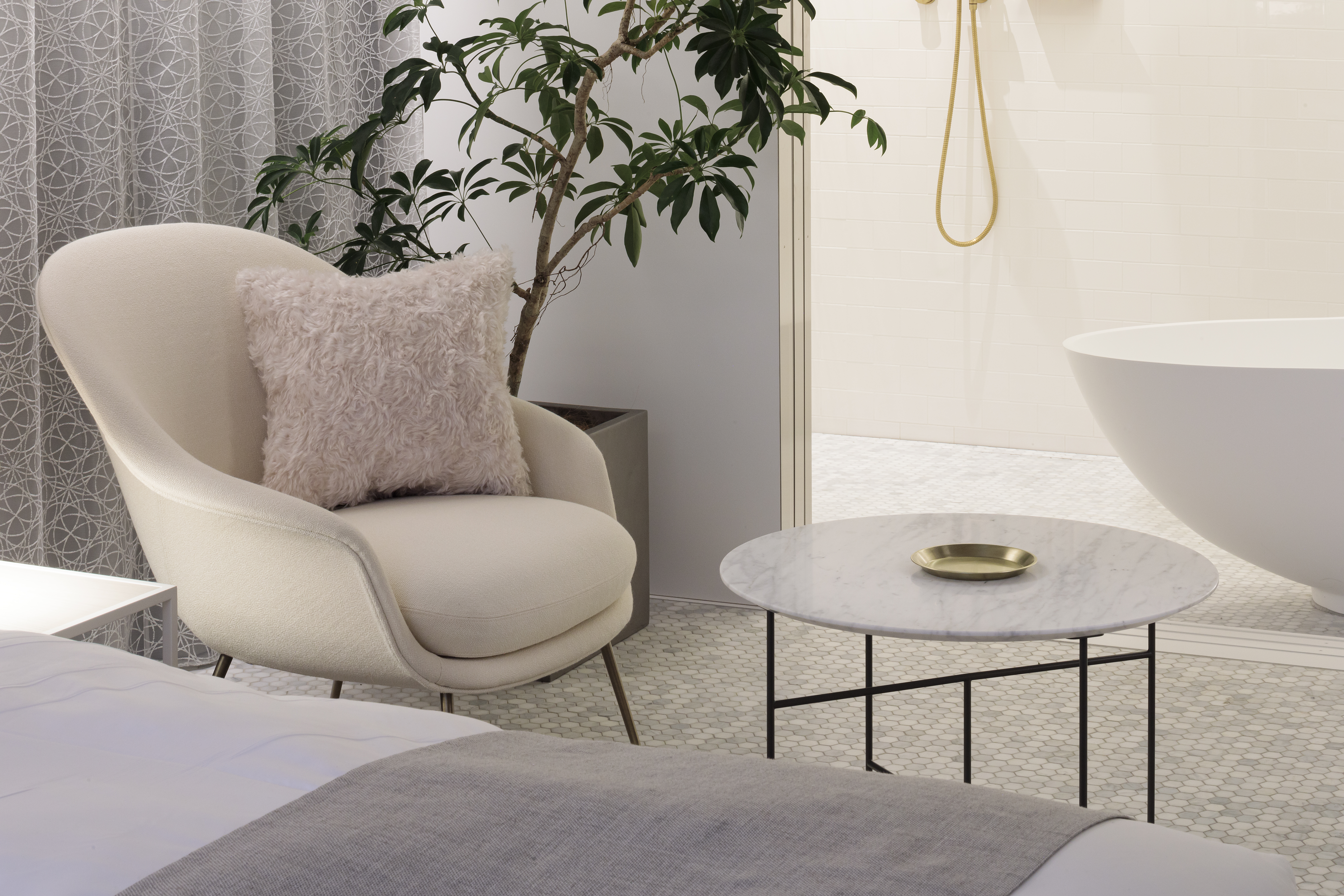 A refined black-themed room featuring iconic global furniture by Le Corbusier, Perriand, Starck, and more, with baanai’s “EMERGE” artwork and elegant silver curtains by Yoko Ando.
