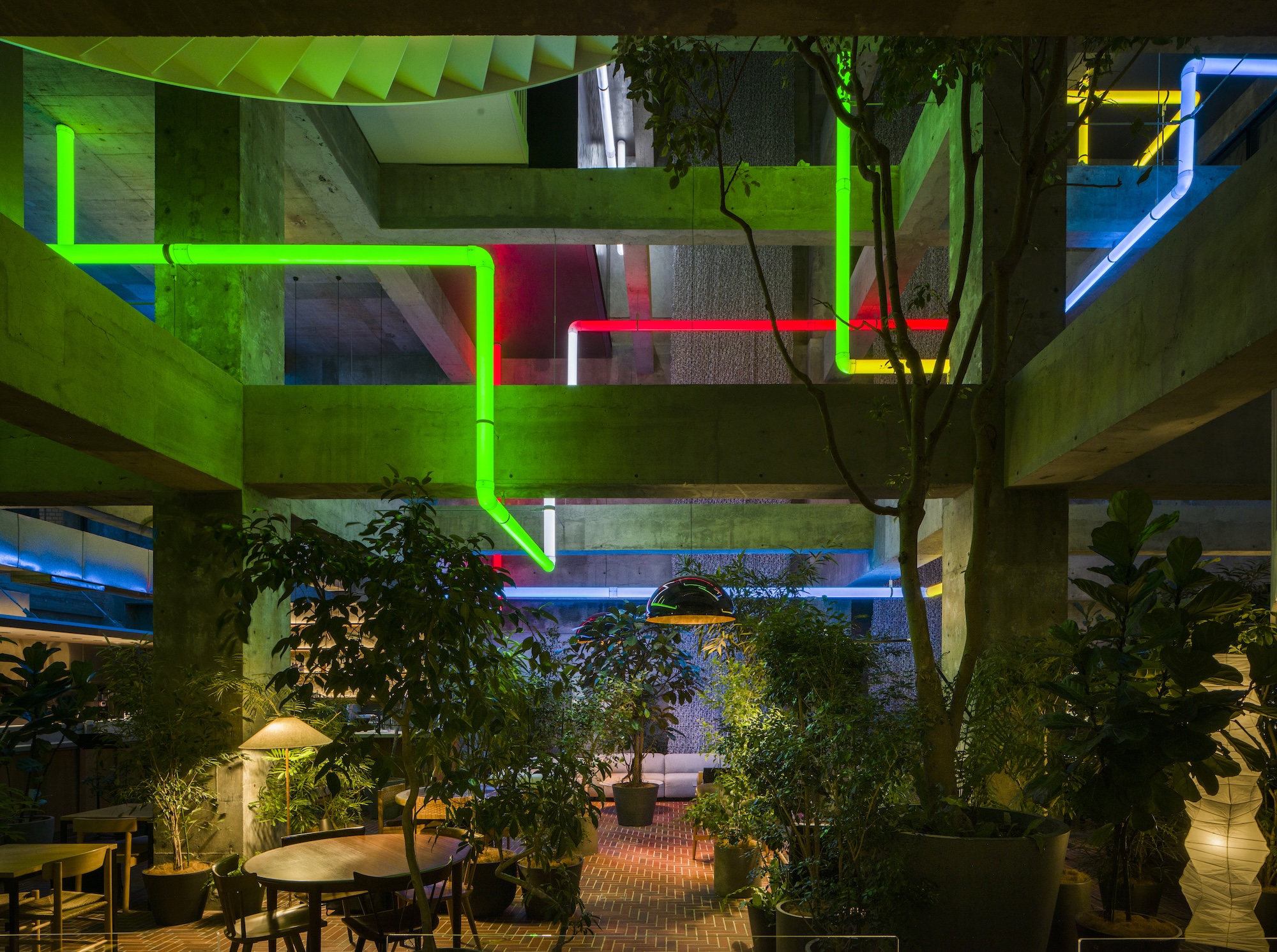 A balcony juts out over the atrium and Leandro Erlich's 'Lighting Pipes' installation, for an exceptional view. With original artworks by Hiraku Suzuki and Mineki Murata.